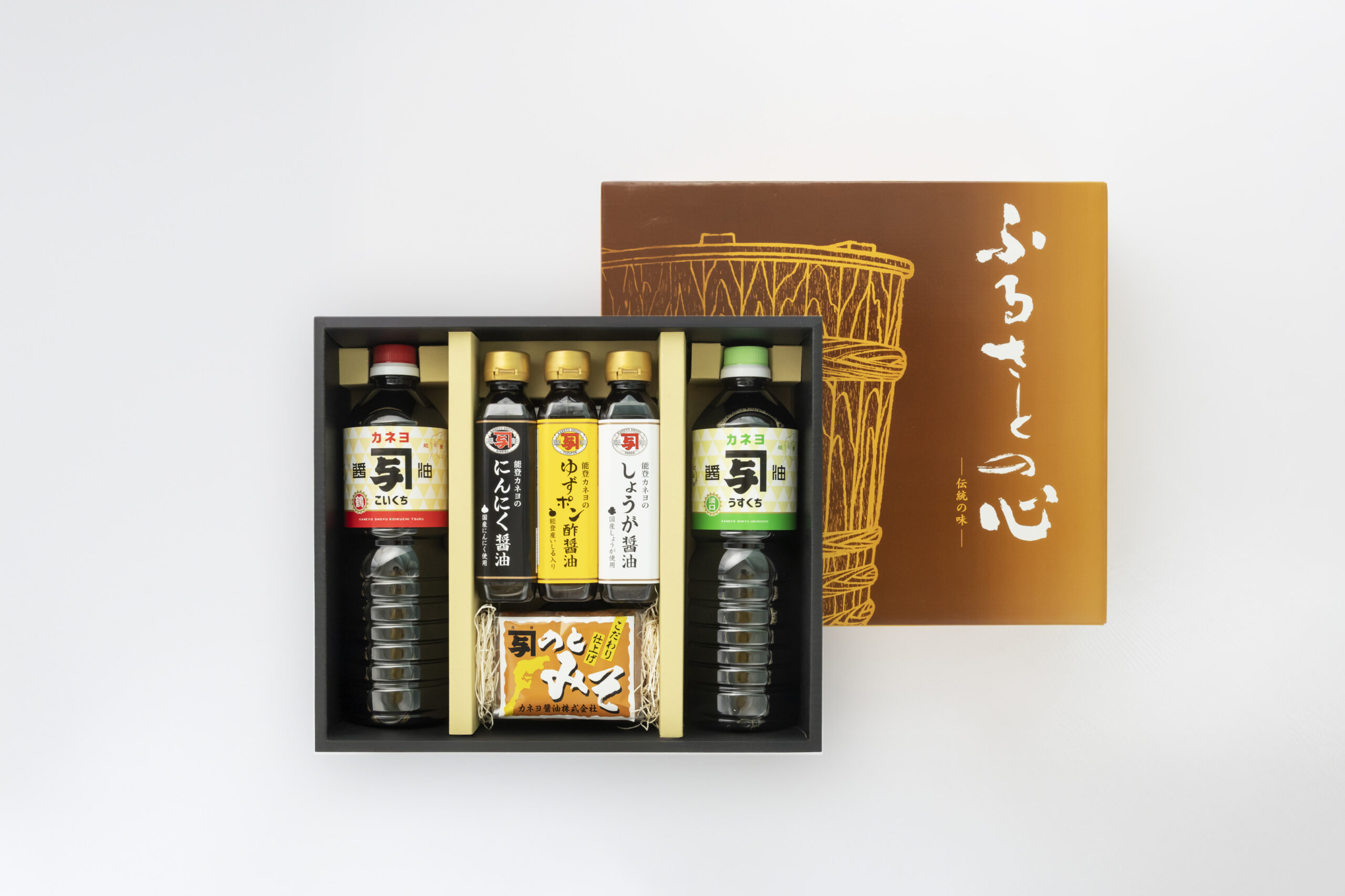 内容量:こいくち醤油(鶴)1L×1本、うすくち醤油1L×1本、ゆずポン酢醤油200ml×1本、しょうが醤油200ml×1本、にんにく醤油200ml×1本、のと味噌500g×1個