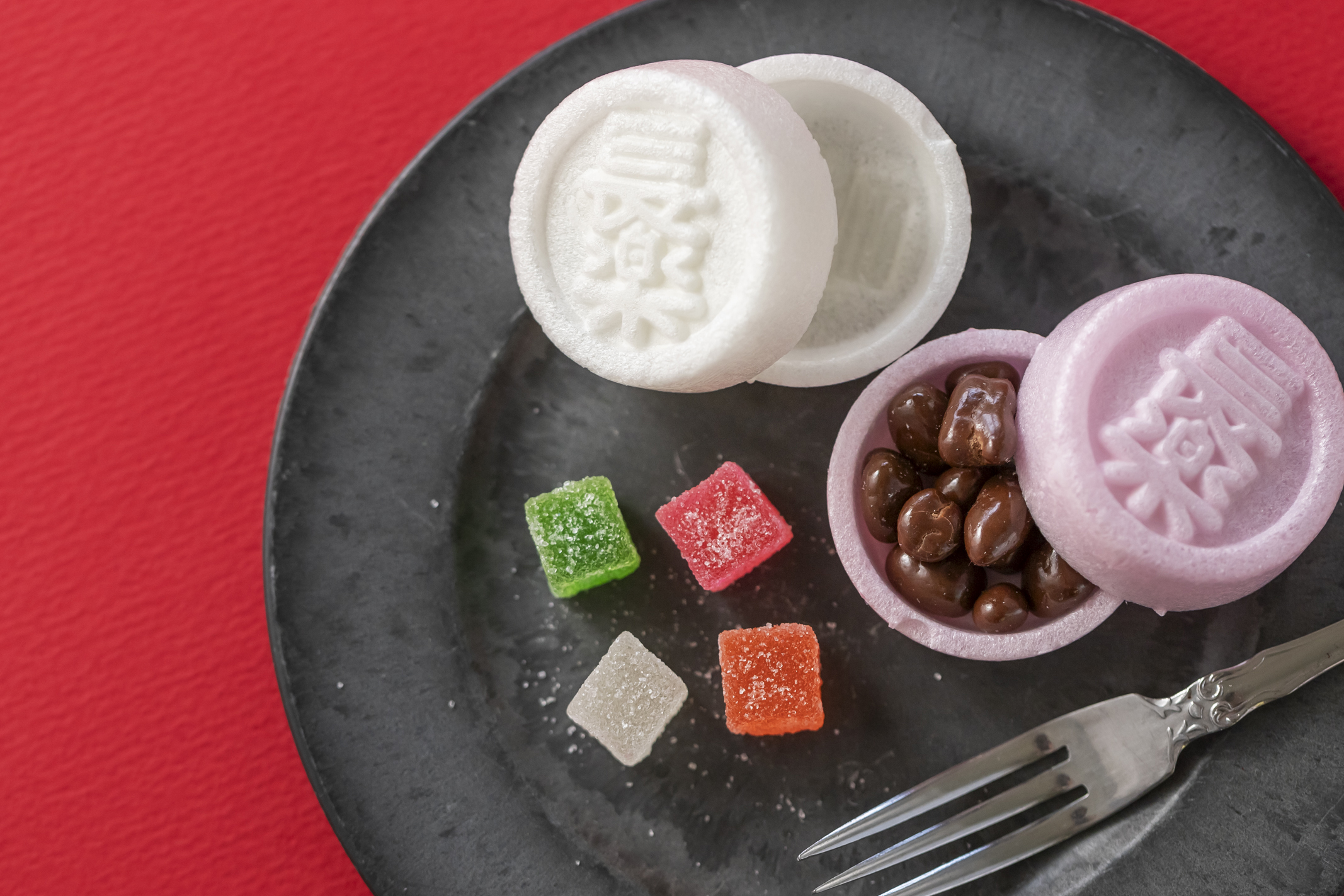 原材料:【金平糖】 グラニュー糖(国内製造)/香料、着色料(赤 3、黄4、青1) 【チョコレート菓子】 砂糖(国内製造、タイ製造)、ココアバター、乳糖、カカオマス、全粉乳、脱脂粉乳、ココアパウダー、植物油脂、でん粉/加工でん粉、増粘剤、(アラビアガム、トラガントガム)、炭酸カルシウム、光沢剤、乳化剤(大豆由来)、着色料(フラボイド、黄5、赤 3、黄4、青1)、香料【麦チョコ】砂糖 (国内製造)、植物油脂、乳糖、小麦粉、ココアパウダー、カカオマス、脱脂粉乳、乳等を主要原料とする食品、全粉乳、バターオイル、ホエイパウダー/乳化剤(大豆由来)香料、光沢剤【市松ゼリー】砂糖(国内製造)、水飴、寒天、乾燥卵白/香料、着色料(青 1、赤3、黄4) 【千鳥(白)】もち米(国産)【月の小石】 砂糖(韓国製造)、植物油脂、ココアパウダー、全粉乳、脱脂粉乳、ココアバター、ココアエキス、粉糖、ゼラチン、着色料(クチナシ、ベニコウジ、ラック、フラボノイド、カラメル)、 加工灣粉、乳化剤(大豆由来)、香料、卵殼Ca、安定剤 、光沢剤【長楽(最中)】もち米(国産)/着色料(青1 、黄4、赤3、赤106) (一部に乳成分・大豆・卵・ゼラチンを含む)