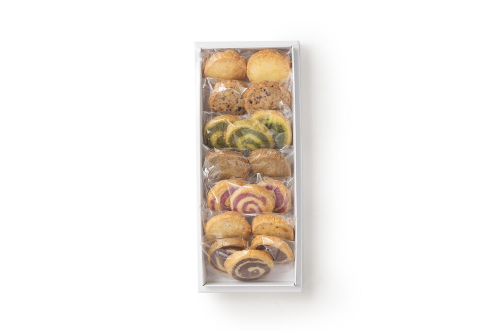 内容量:うずまきクッキー(ココア3枚、抹茶3枚、紫芋3枚)、ココナッツクッキー2枚、くるみクッキー2枚、紅茶クッキー2枚、チョコチップクッキー2枚